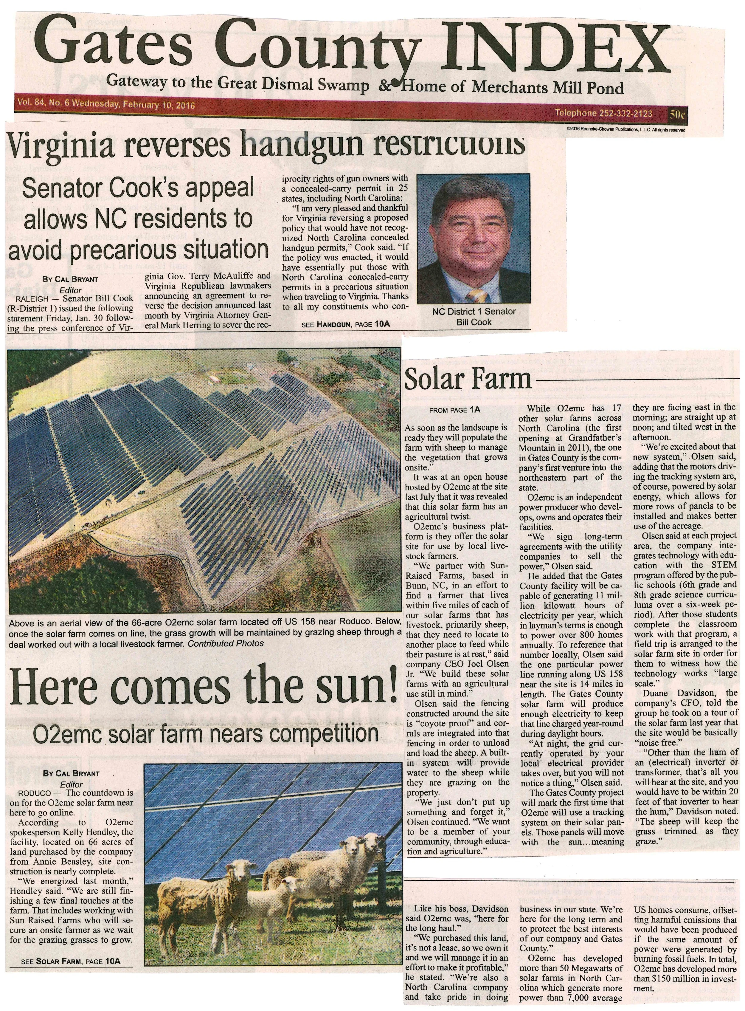 O2 emc developed Gates Solar in 2015, a 5.0 MW AC (6.96MW DC) solar farm located in Eure, Gates County, NC.